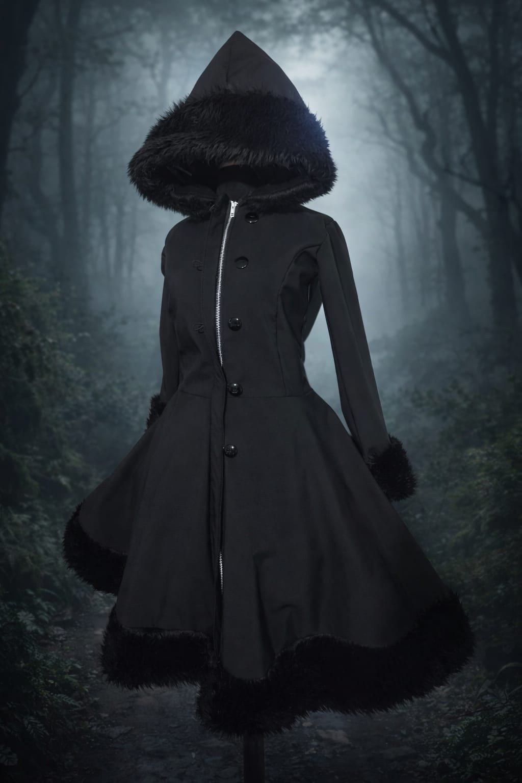 Abrigo impermeable softshell para la lluvia, nieve y frio. Diseño con falda plato, detalle de piel cinética en mangas y gorro, ruedo con cierre botones.