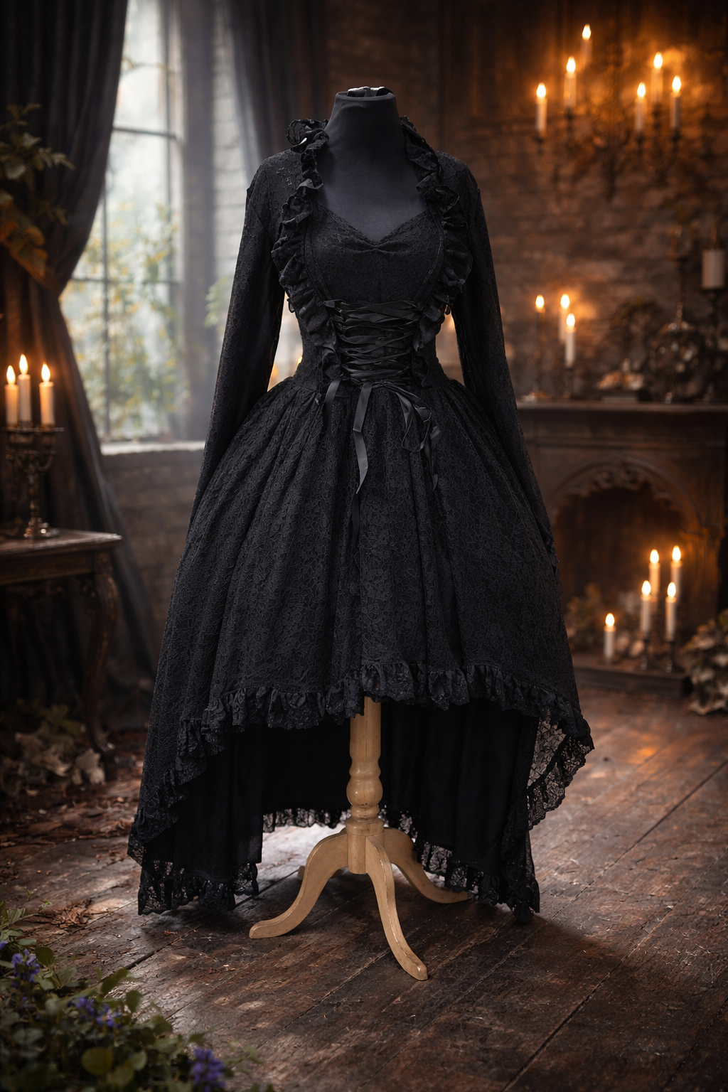 Vestido escote corazon con cola elasticado, estilo medieval forrado con encaje y lindos detalles de blonda, corset para ajustar.
