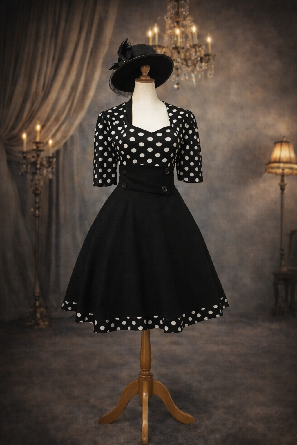 Vestido estilo pin up elasticado con manga, falda plato con pretina.