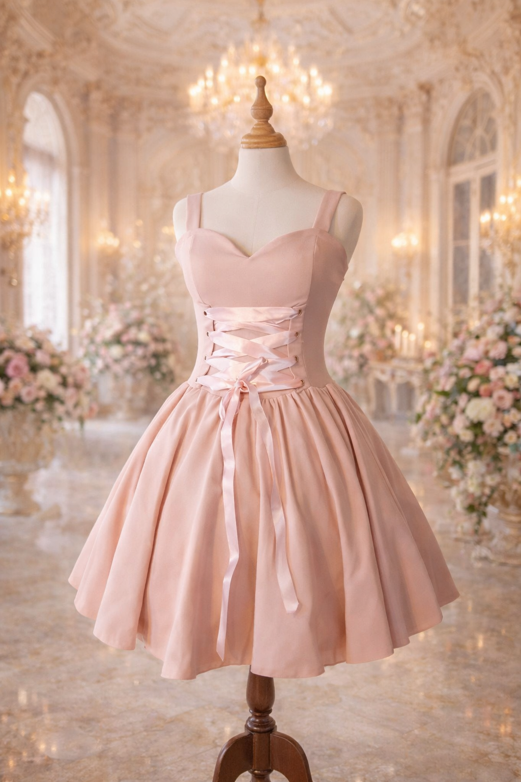 Vestido elasticado escote corazon, falda con pliegues, corset para ajustar.