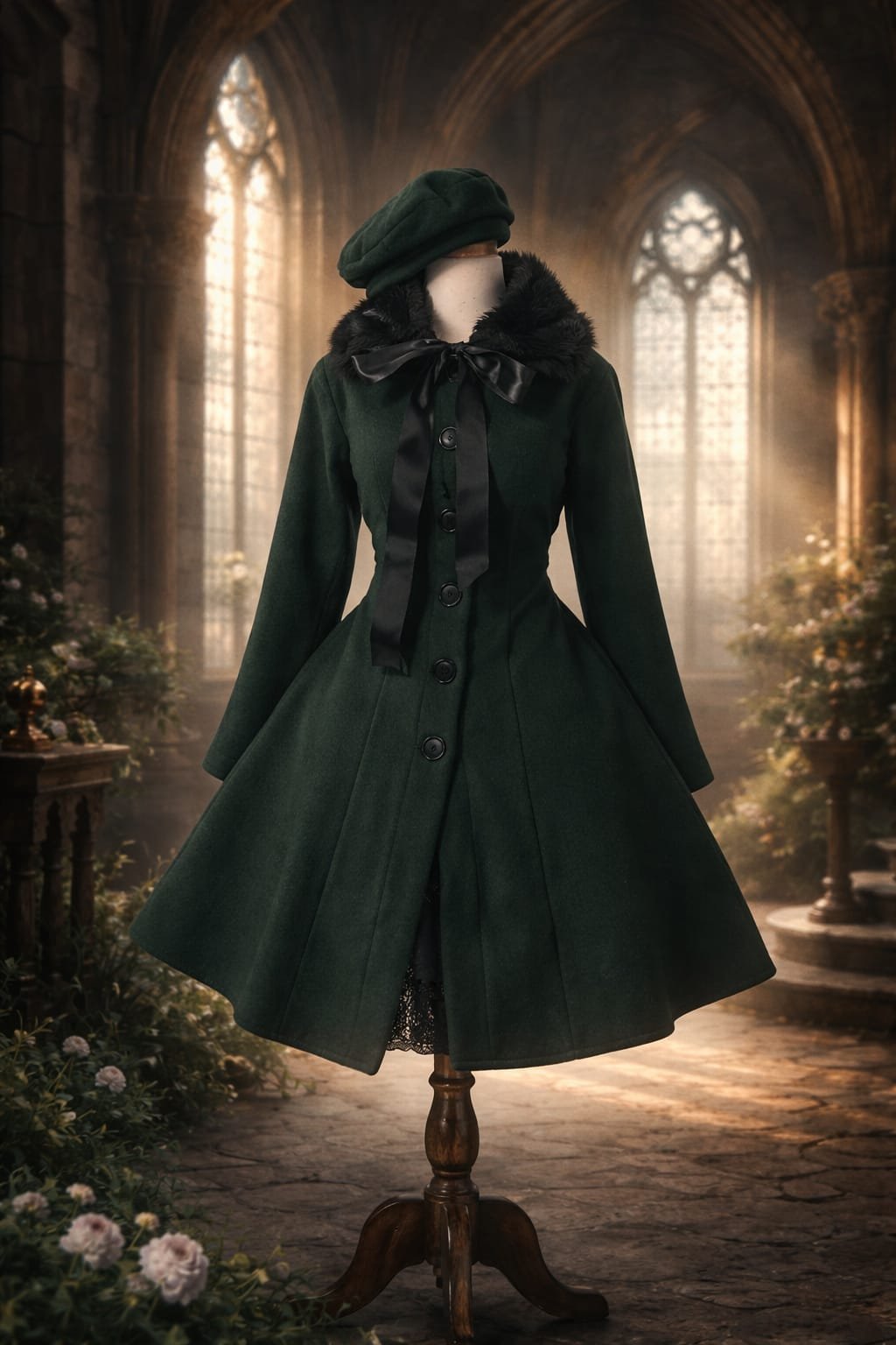Abrigo impermeable gato acampanado piel cinética mangas gorro cierre y broches metálicos.