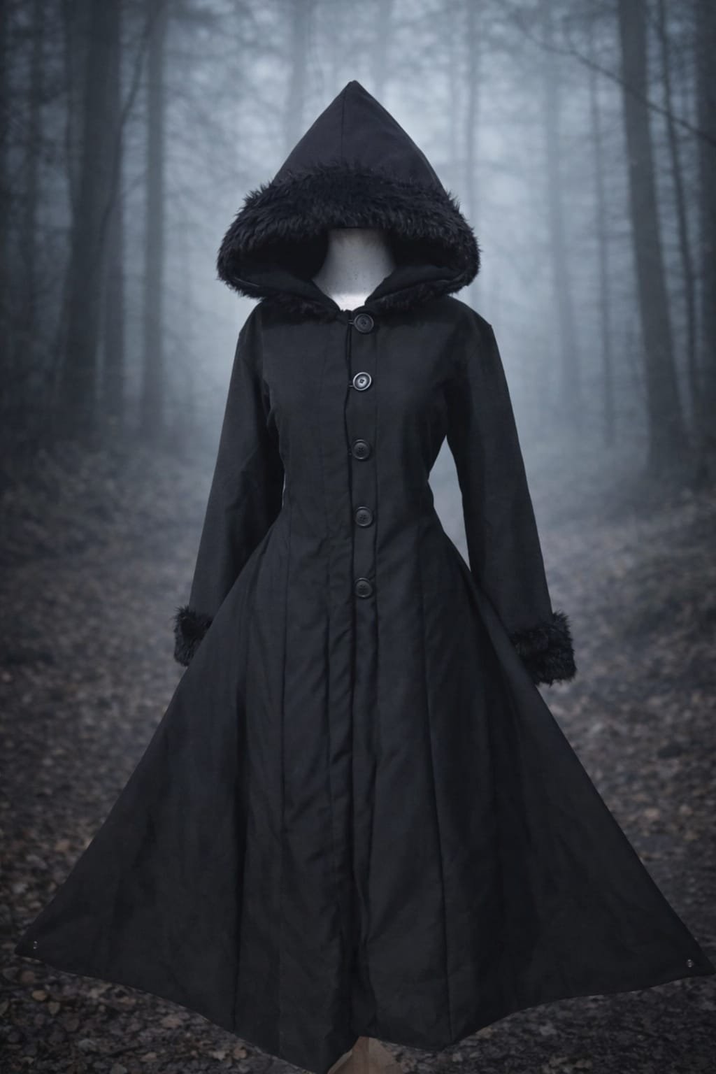 Abrigo impermeable softshell acampanado para la lluvia, nieve y frio, con botones y piel en mangas y gorro.