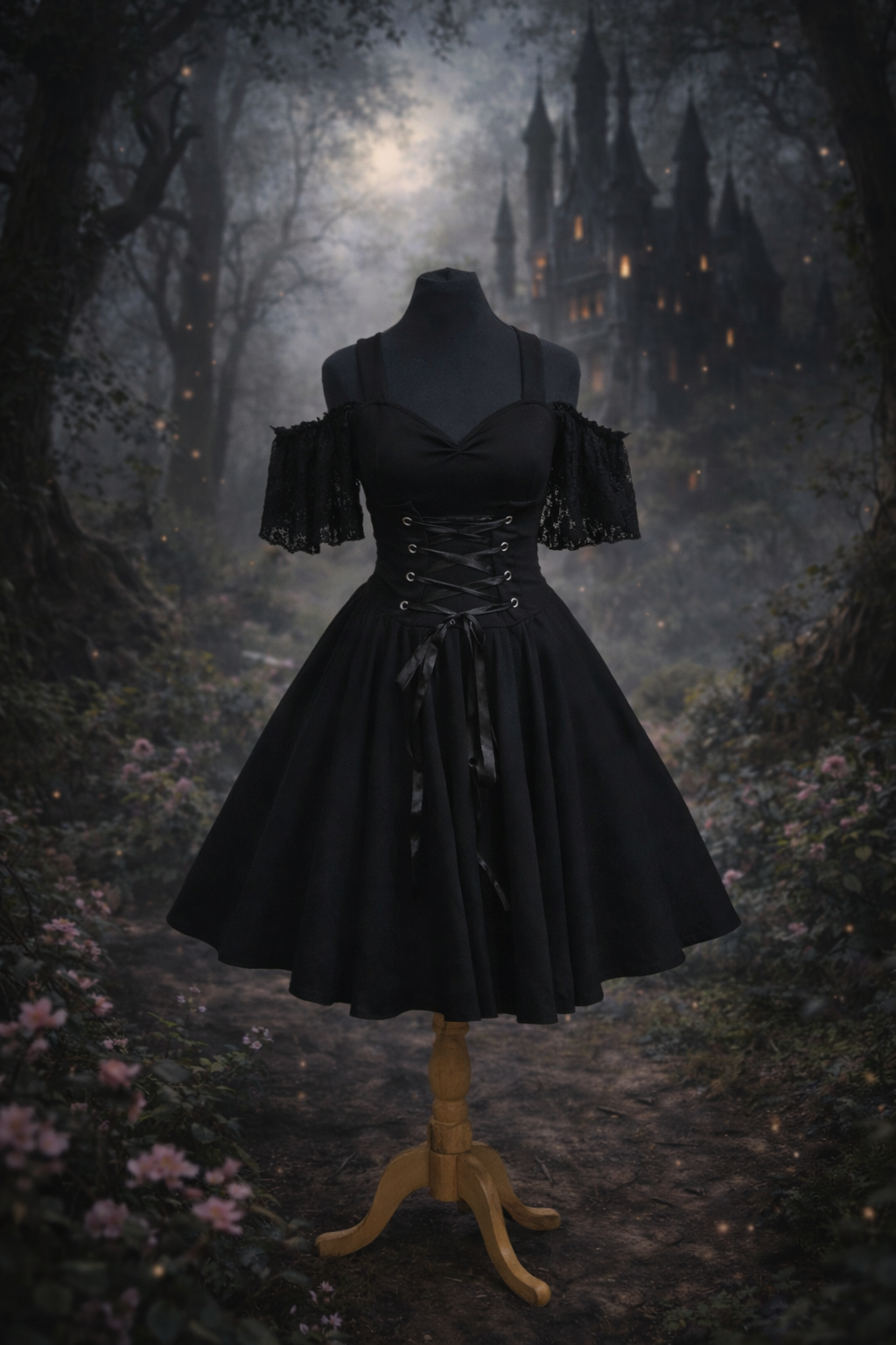 Vestido elasticado, escote corazon con tirantes, mangas elasticadas a los hombros de encajes, corset para ajustar, falda plato con pliegues.