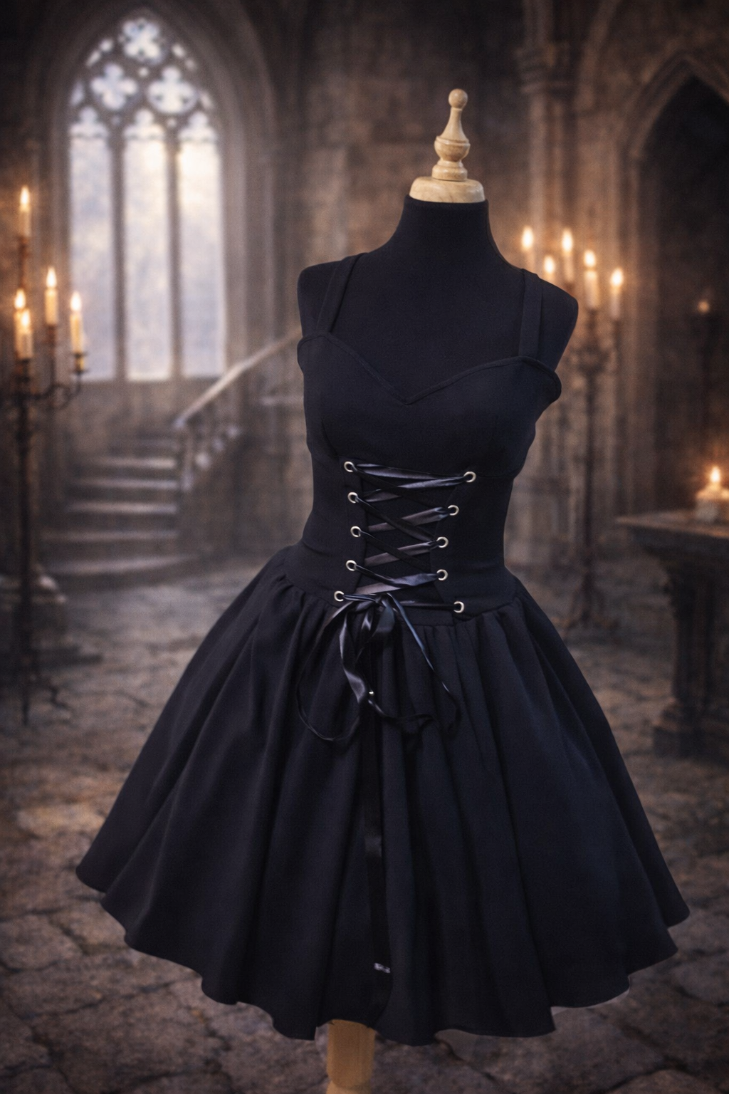 Vestido elasticado escote corazon, falda plato con pliegues y corset para ajustar.