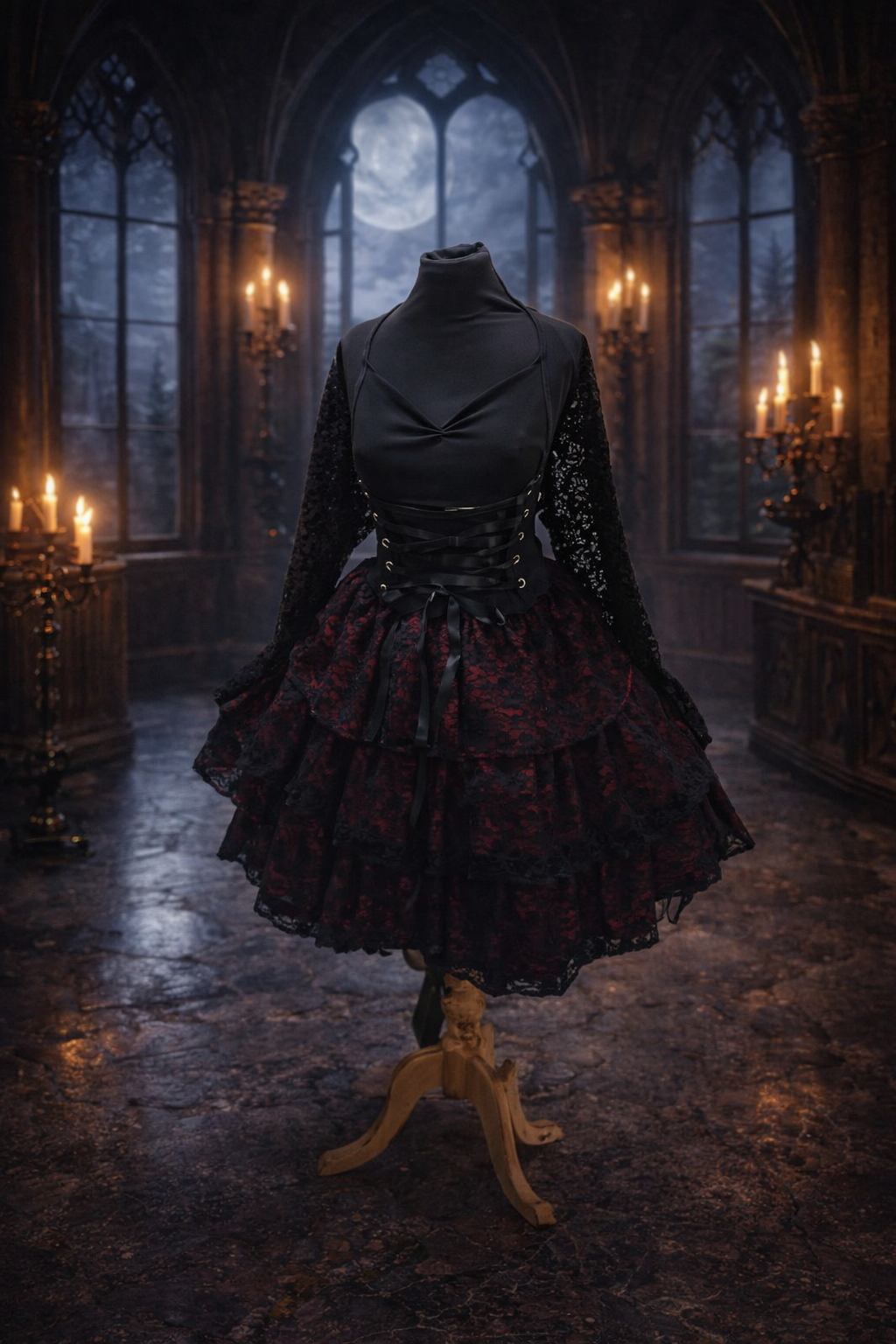 Vestido elasticado escote corazon mangas de encaje, corset para ajustar, falda 3 capas de encajes con pliegues.
