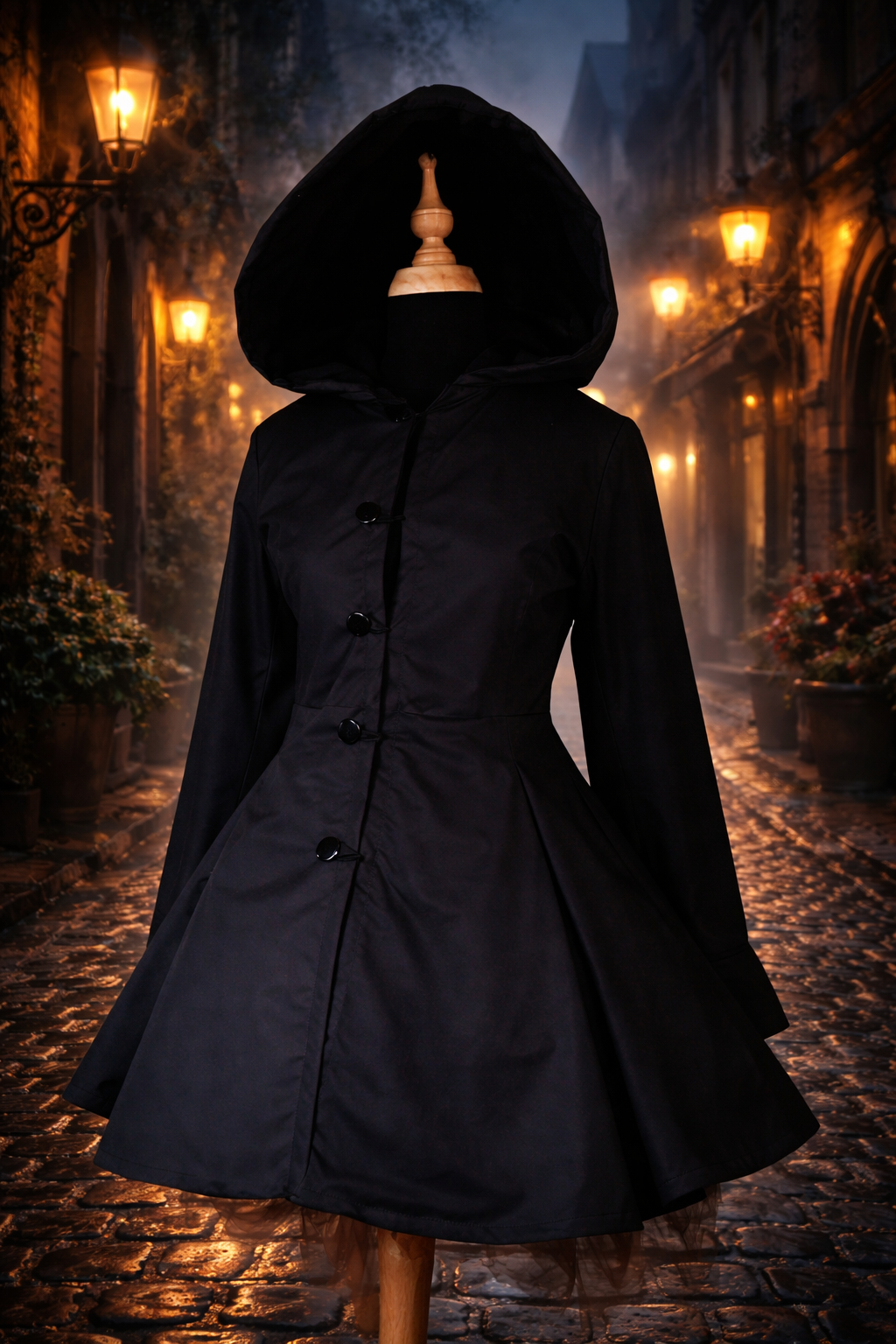 Abrigo impermeable gato piel cinética mangas gorro cierre y botones.