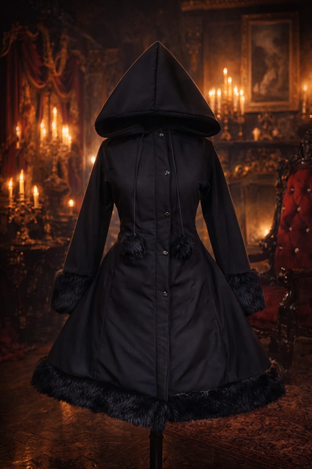 Abrigo impermeable gato piel cinética mangas gorro cierre y botones.