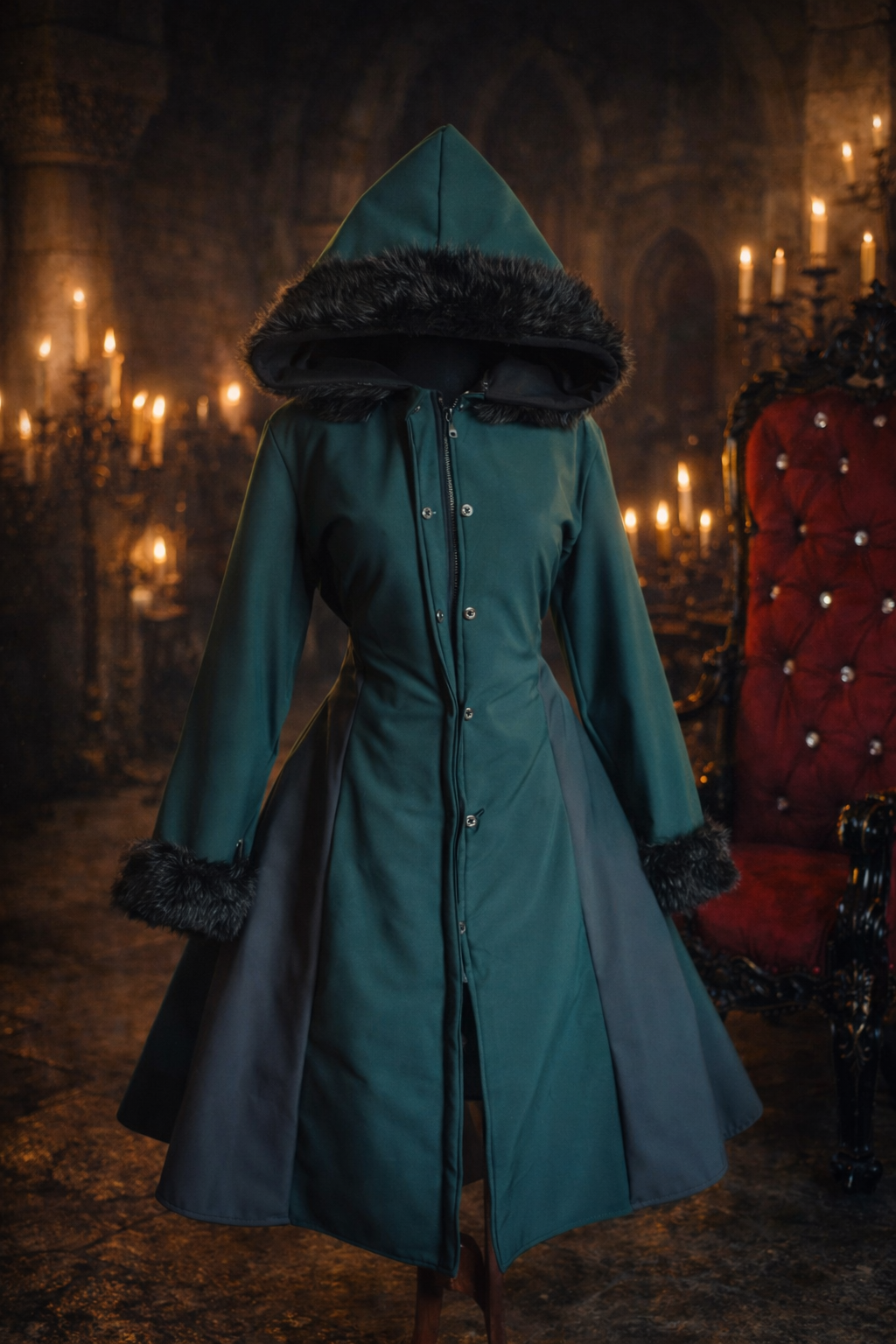 Abrigo impermeable gato piel cinética mangas gorro cierre y botones.