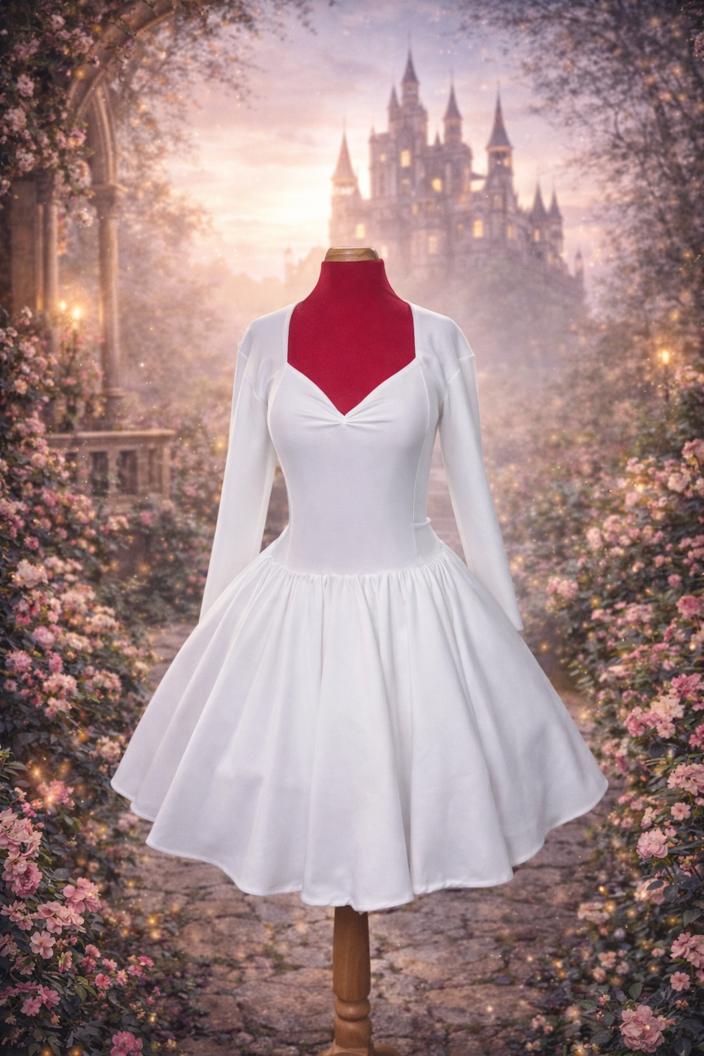 Vestido elasticado falda plato con pliegues, escote corazon, manga larga.