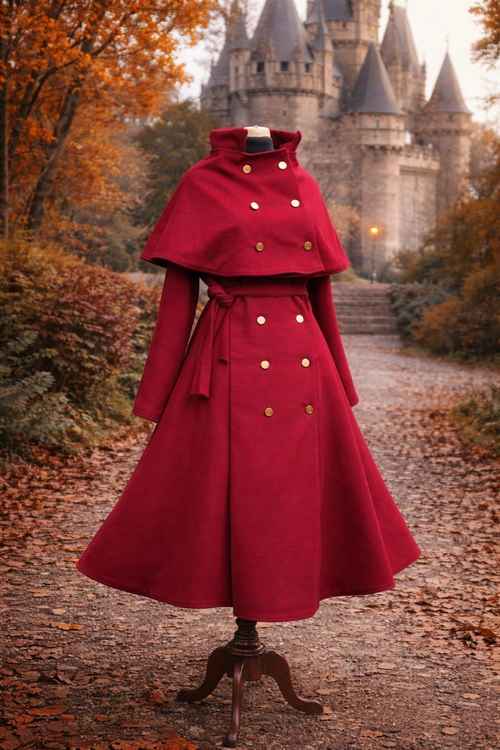 Abrigo largo de paño de lana, estilo militar, doble botones dorados y detalles de capa.