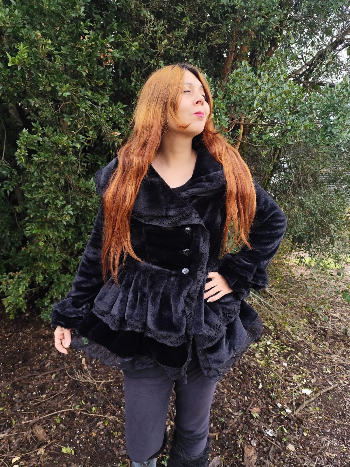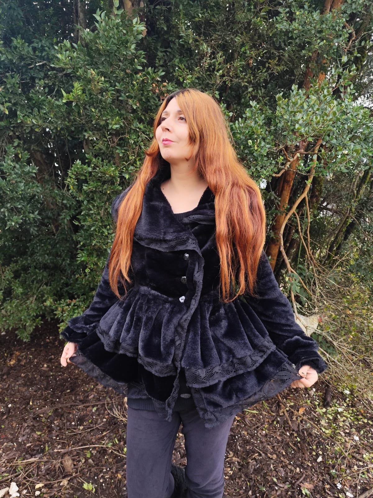 Abrigo de terciopelo invernal cuello fantasía con blonda y corset para ajustar y mangas acampanadas.